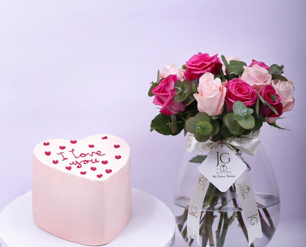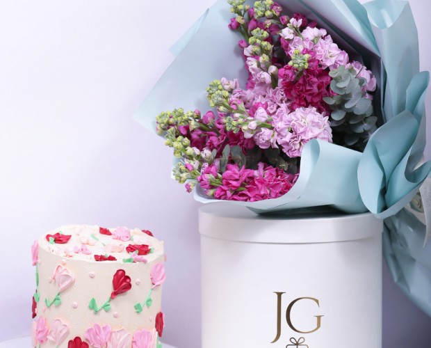 A refined bouquet of 12 pink Matthiola blooms, wrapped in cloud-colored paper. Elegant and soft.An elegant rose cake crafted with delicate details and..